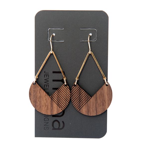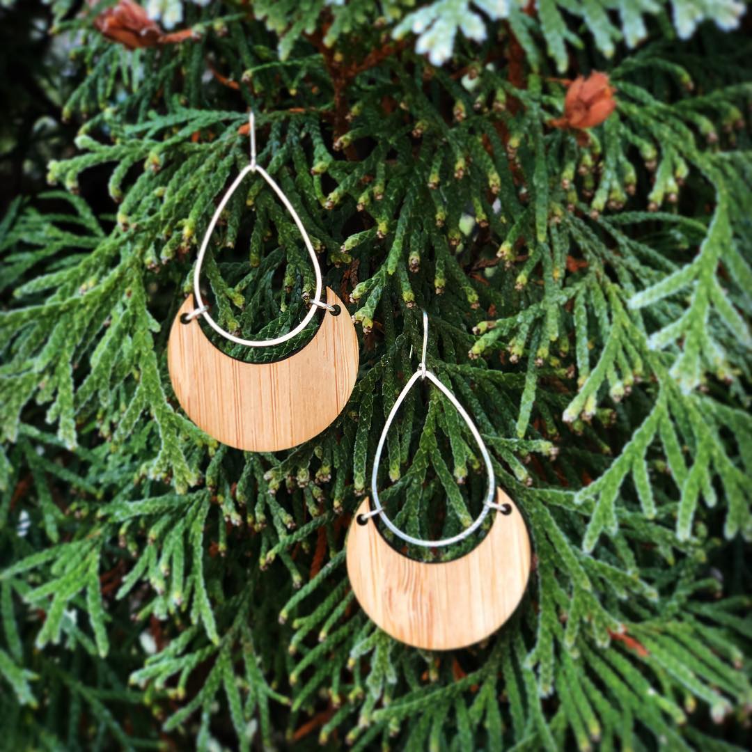 Nicole uses bamboo and walnut woods left over from her friend’s guitar making to create intricate cut earrings and necklaces accented with paints, silver and gold.